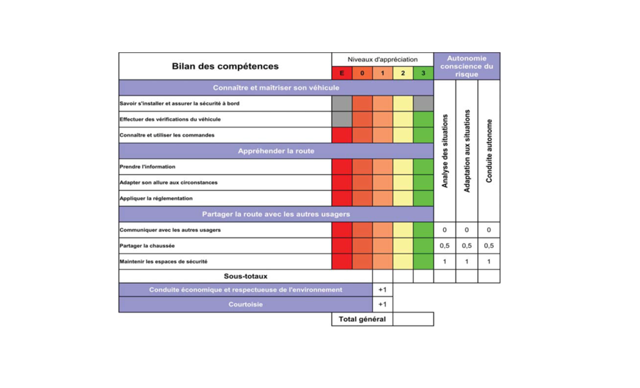 Afin de disposer de repères, quatre grilles de progression accompagnent l’élève dans l’acquisition des compétences. Elles détaillent les savoirs comportementaux, techniques et environnementaux dont doit disposer l’élève conducteur au fur et à mesure de son évolution.