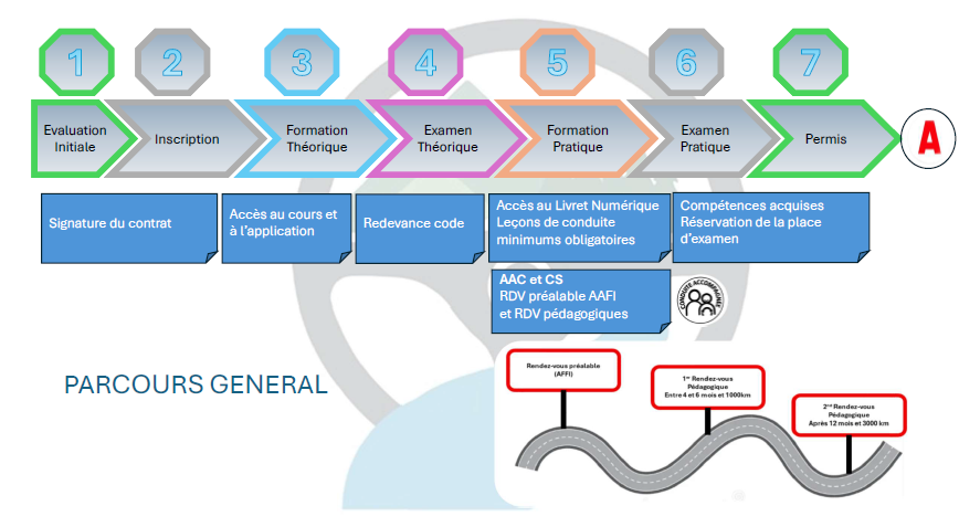 Une évaluation de départ est obligatoire avant la signature du contrat d’inscription et permet de mesurer le niveau du stagiaire, afin de déterminer un prévisionnel d’heures de formation afin d’atteindre le niveau permettant de réussir l’examen de conduite et le coût de sa formation. L’évaluation est effectuée sur une application ou sur véhicule.