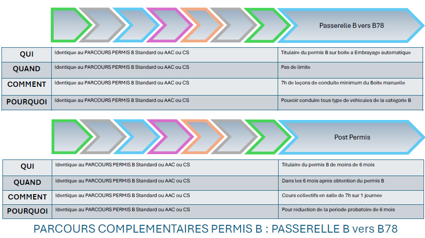 - La passerelle B78 qui permet à partir du permis B sur boite automatique de conduite tous type de véhicule de catégorie B : 7 heures minimum de leçon de conduite.